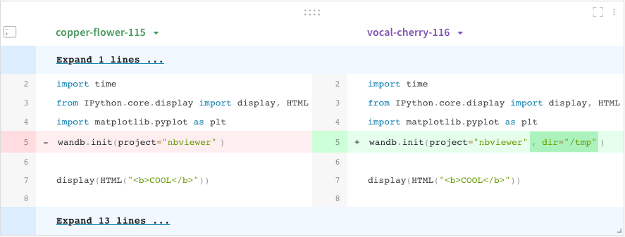 デフォルトでは、W&Bは最新のgitコミットハッシュのみを保存します。UIで実験間のコードを動的に比較するためのより多くのコード機能を有効にできます。