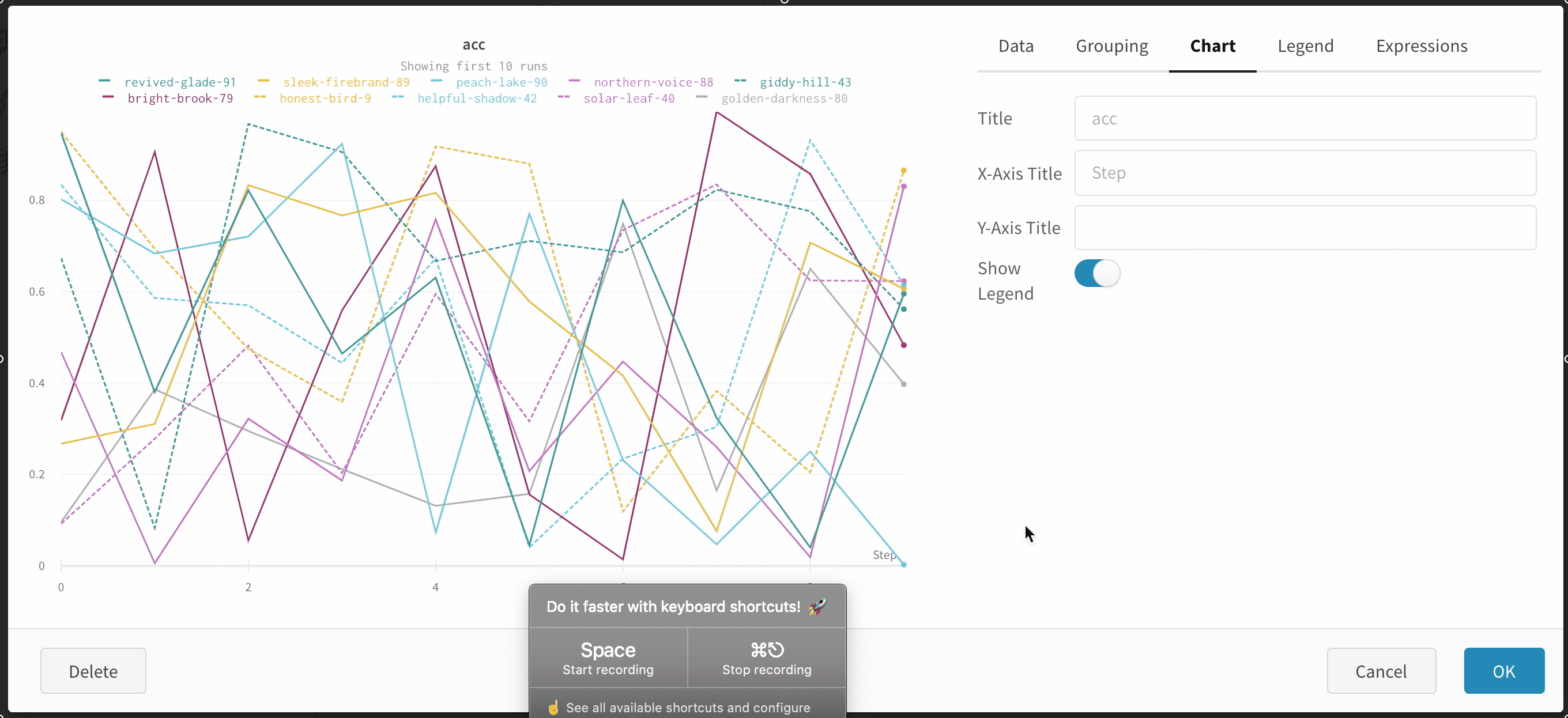- X: X 軸に使用する値を選択します (デフォルトは Step です)。X 軸を 相対時間 に変更したり、W&B でログを取った値に基づいてカスタム軸を選択したりできます。