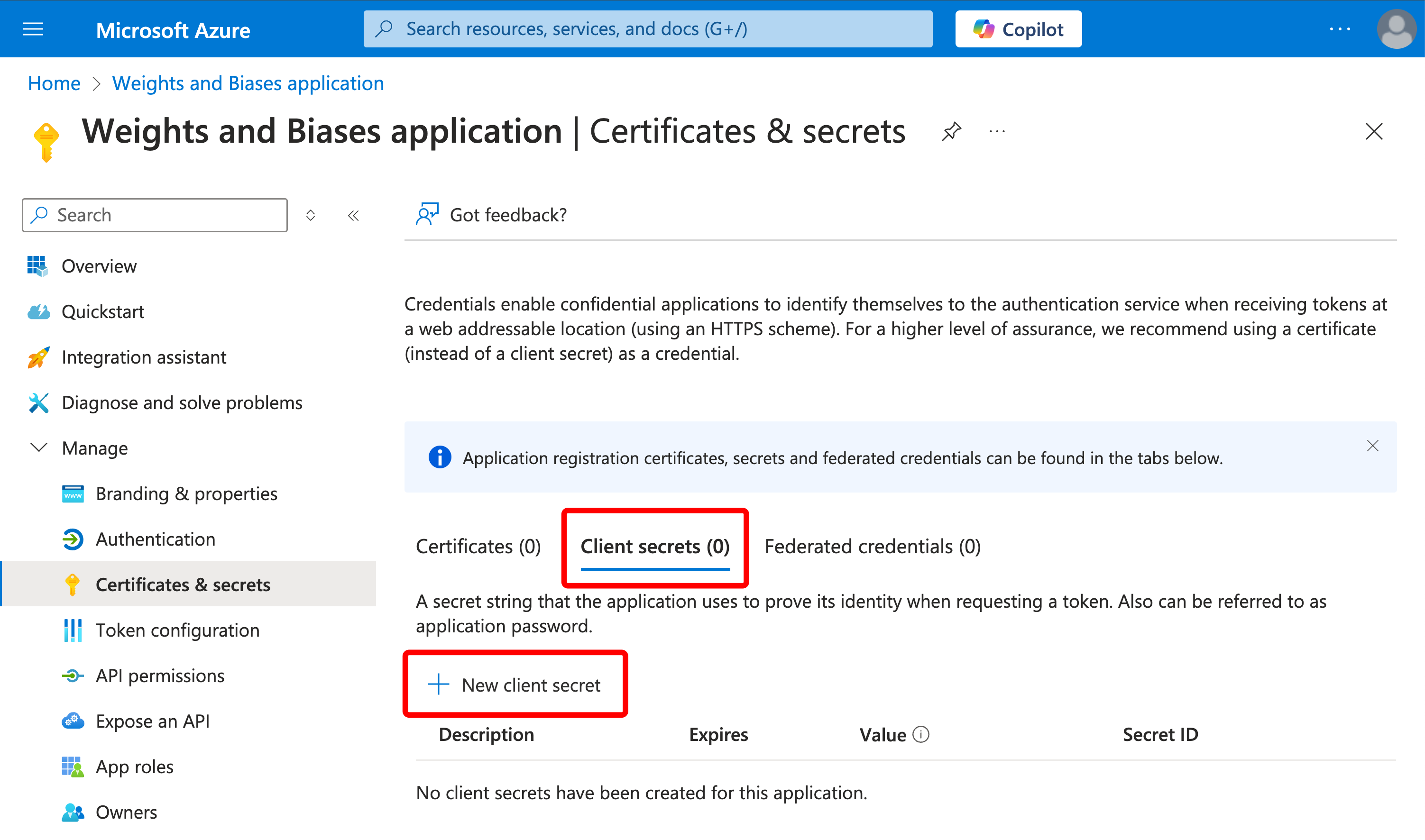 - 「Client secrets」をクリックし、「New client secret」をクリックします。