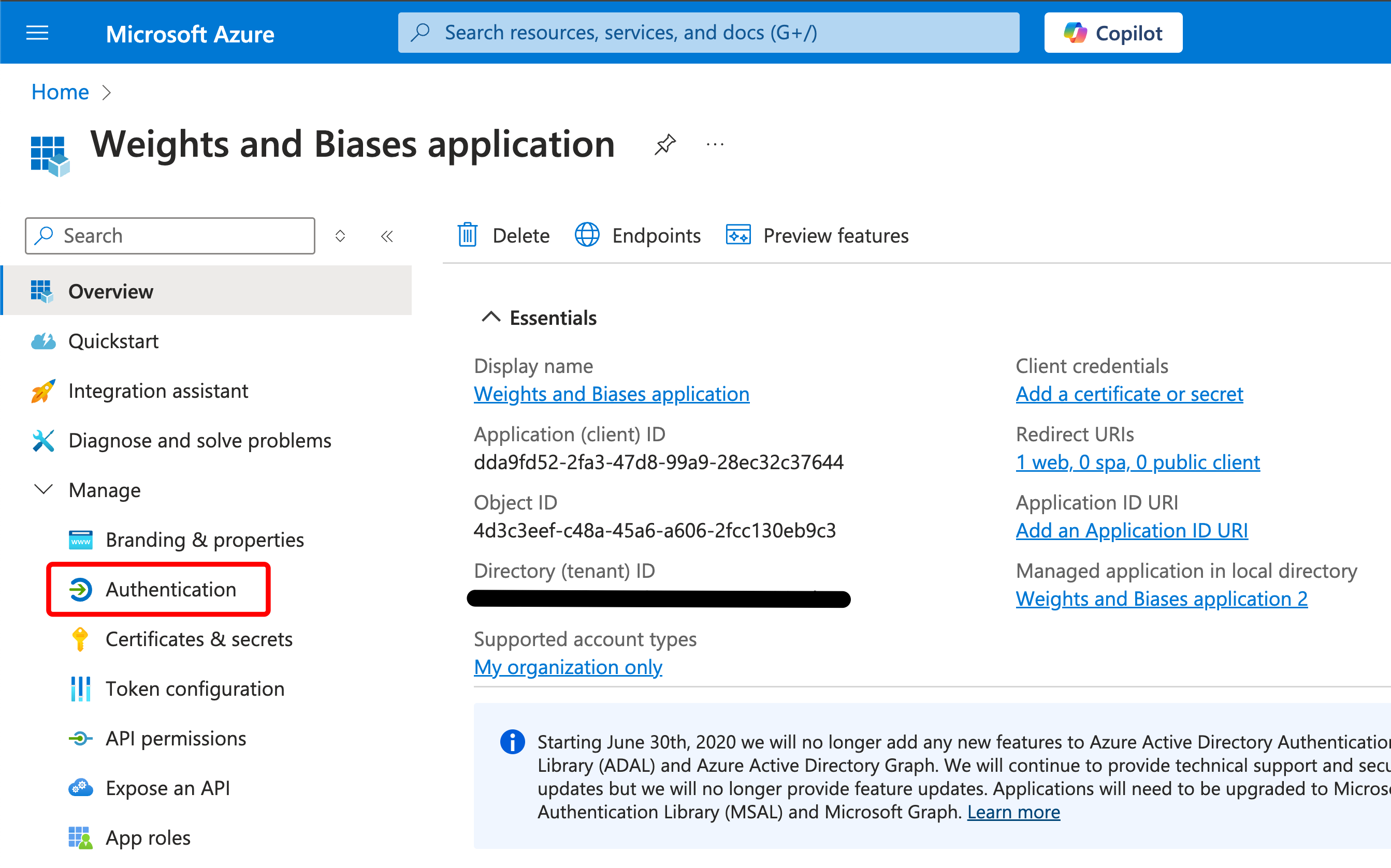 「アプリケーション (client) ID」と「ディレクトリ (テナント) ID」をメモしておいてください。