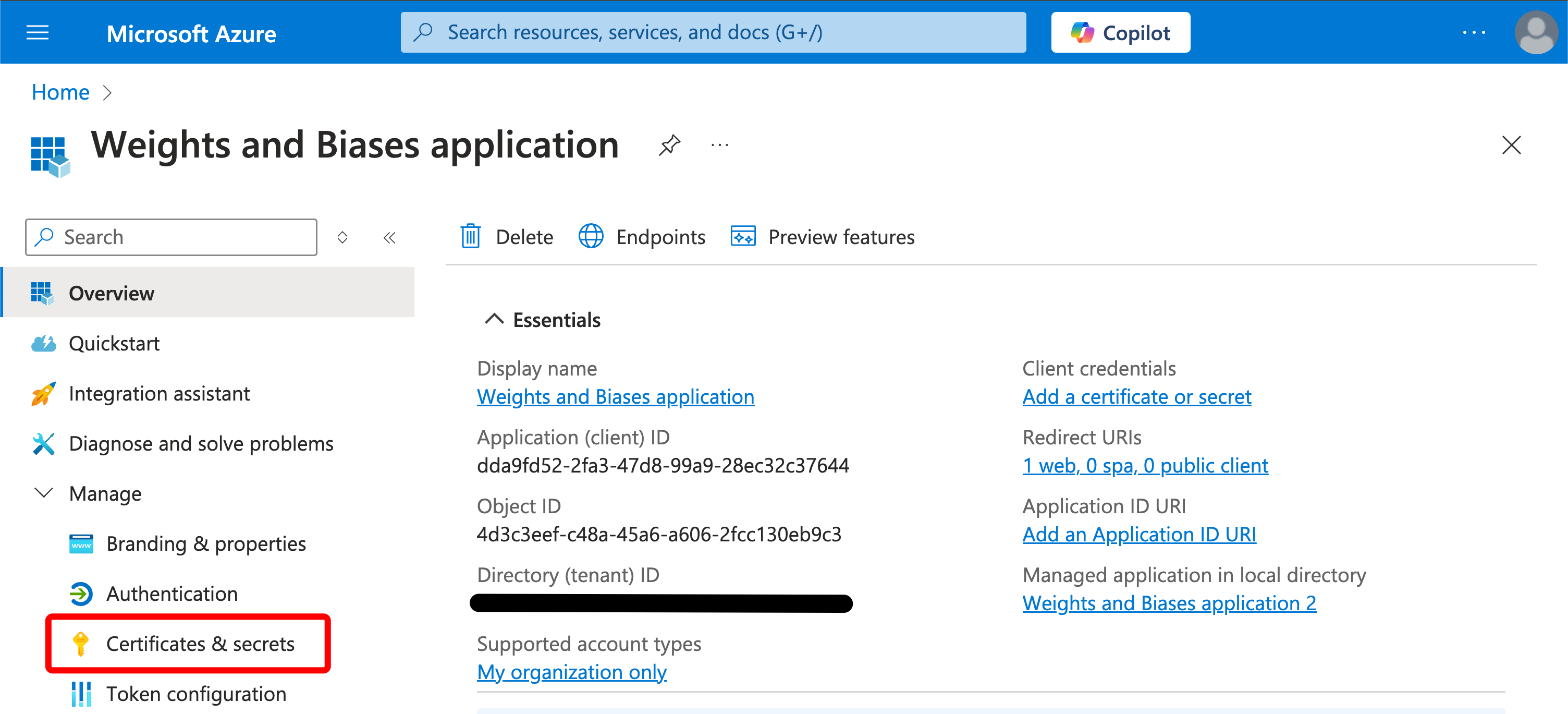 左側のサイドバーで「Certificates & secrets」をクリックします。