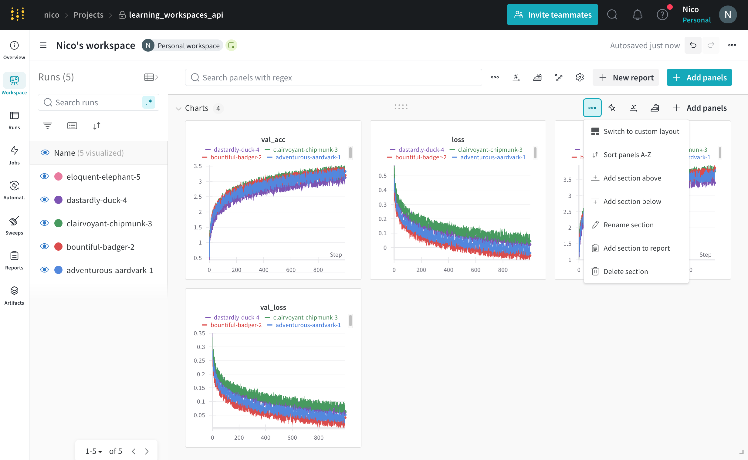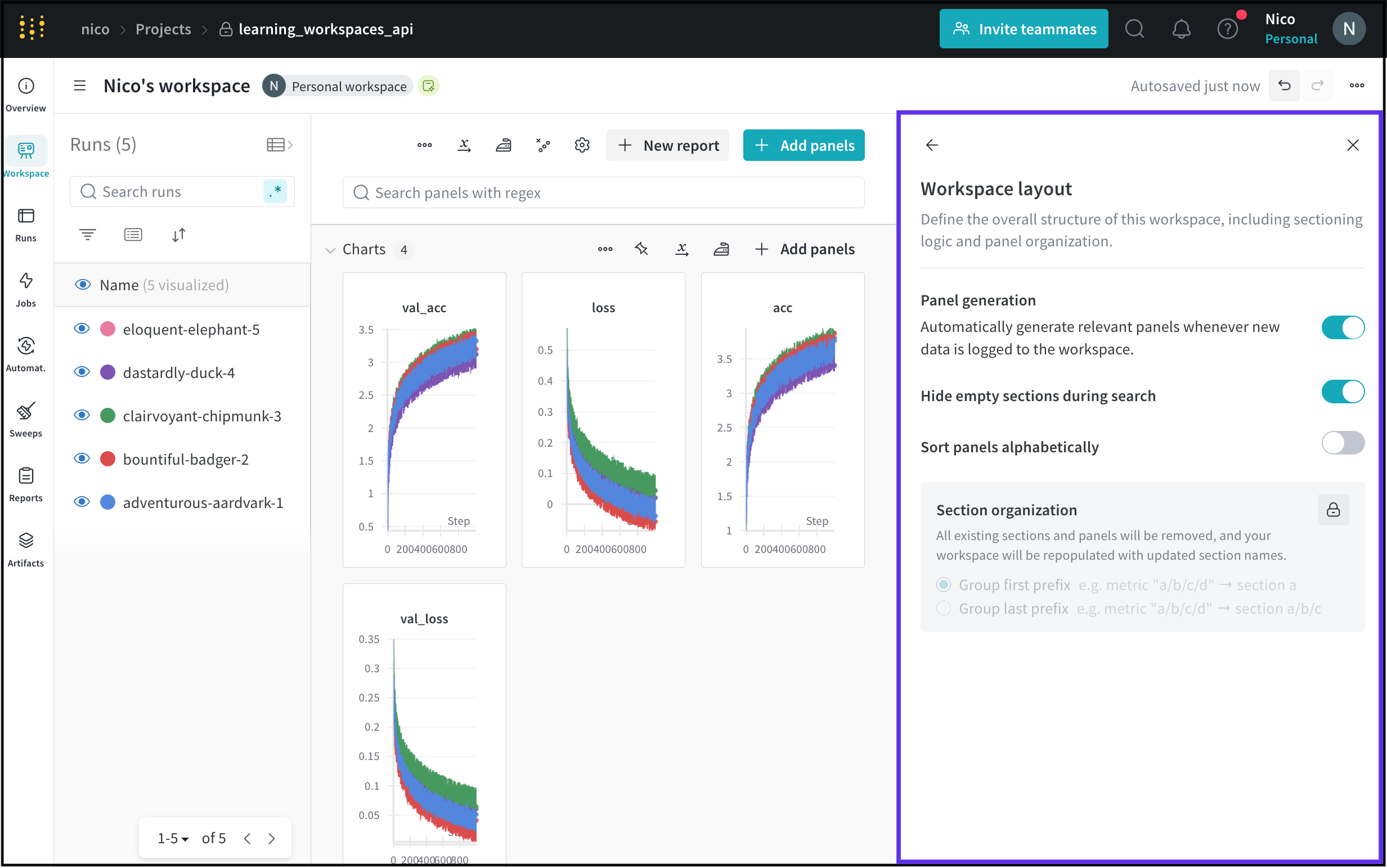 섹션 설정은 해당 섹션 내의 모든 패널에 적용됩니다. 워크스페이스 섹션 내에서 패널을 정렬하고, 패널을 재정렬하고, 섹션 이름을 바꿀 수 있습니다.