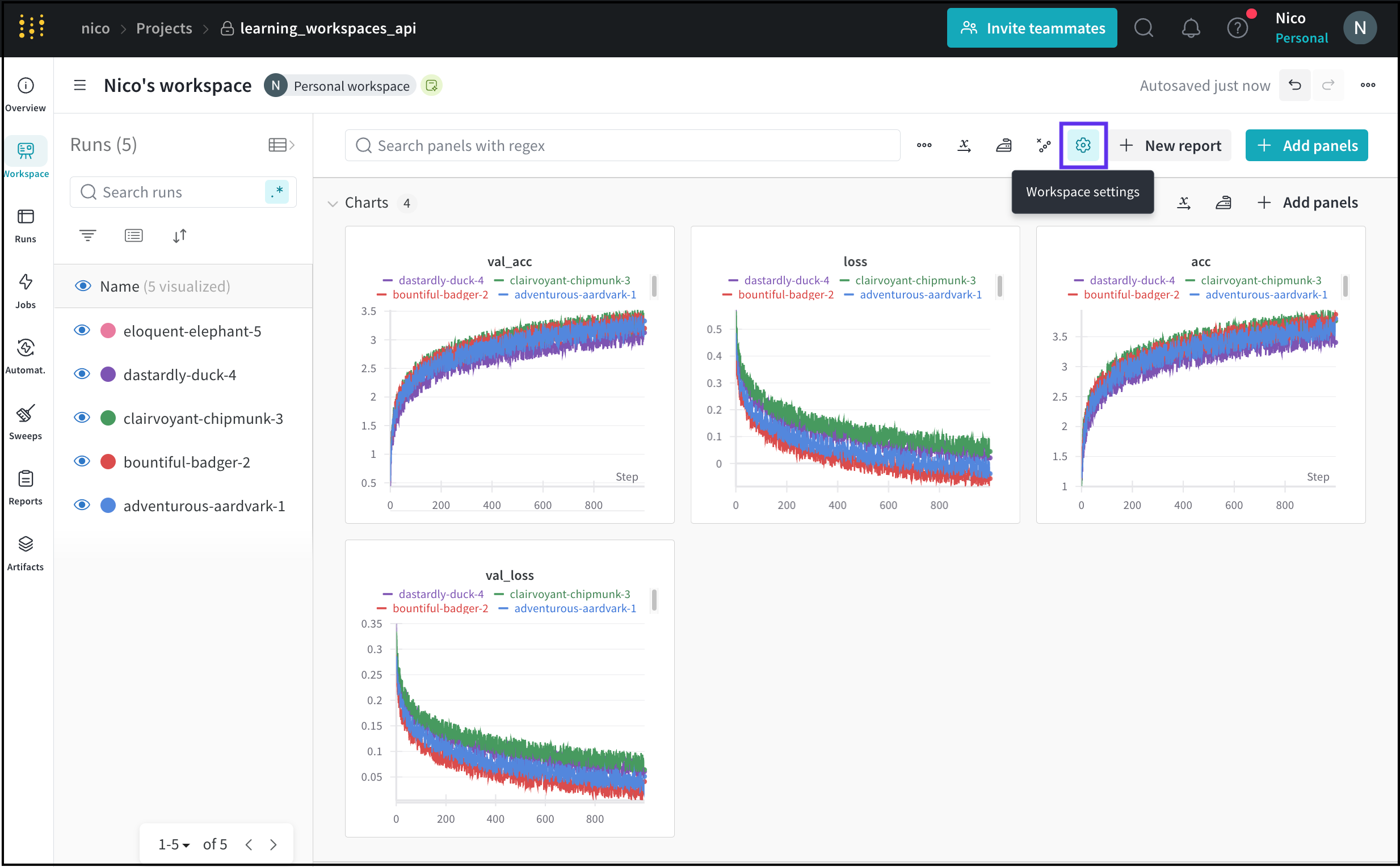 - 새 리포트 버튼 옆에 있는 톱니바퀴 아이콘을 클릭하여 워크스페이스 설정을 확인합니다.