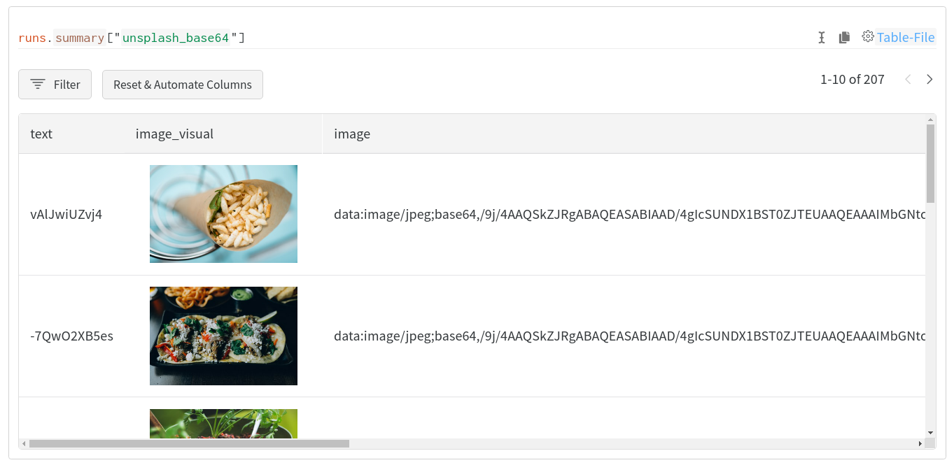 W&B 는 이미지 및 명명된 엔티티 필드를 wandb.Image 및 wandb.Html 로 자동 변환하려고 시도합니다. 이러한 시각화를 포함하기 위해 결과 테이블에 추가 열이 추가될 수 있습니다.
