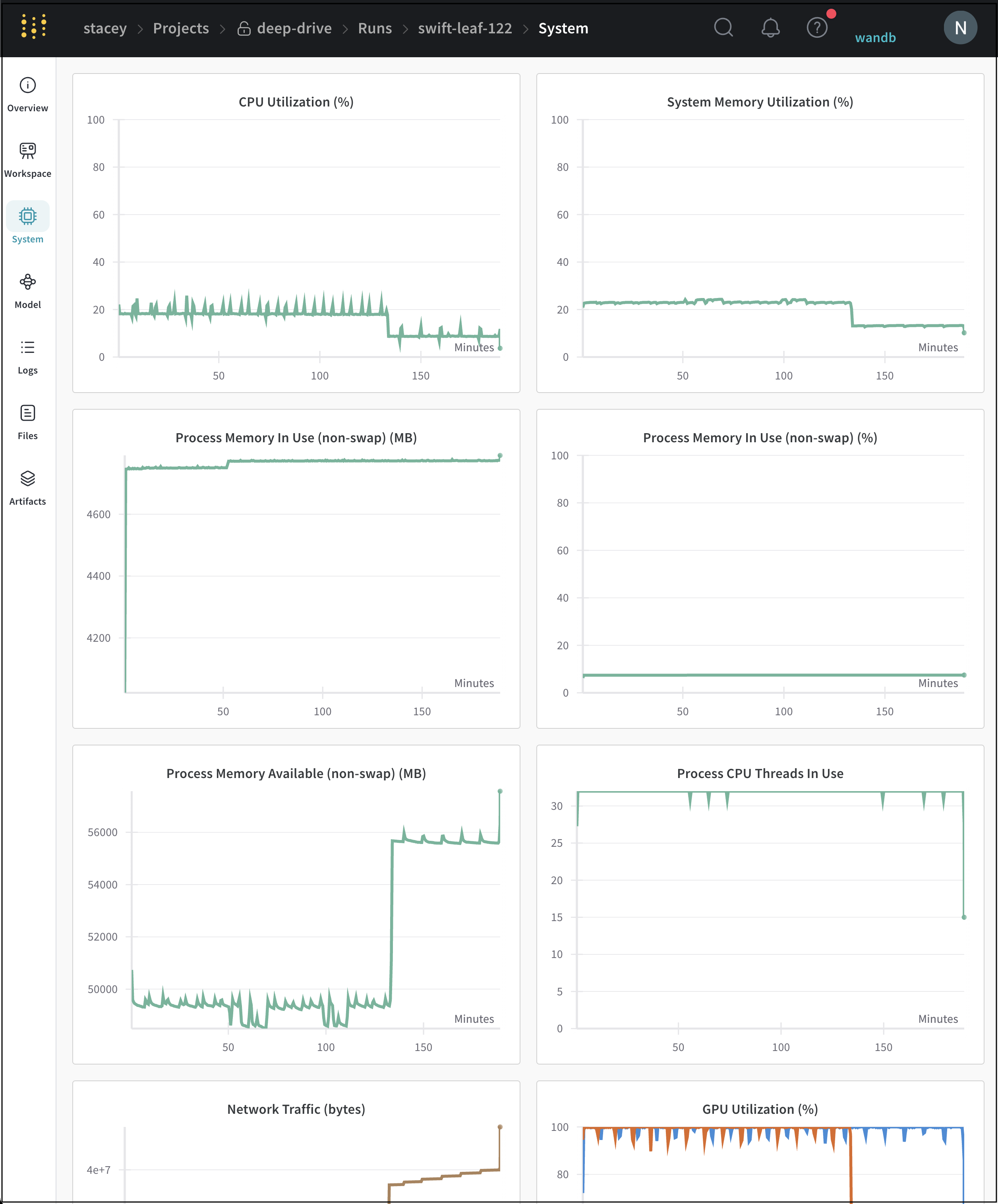 System 탭은 CPU 사용률, 시스템 메모리, 디스크 I/O, 네트워크 트래픽, GPU 사용률 등과 같은 특정 run에 대해 추적된 시스템 메트릭을 보여줍니다.
