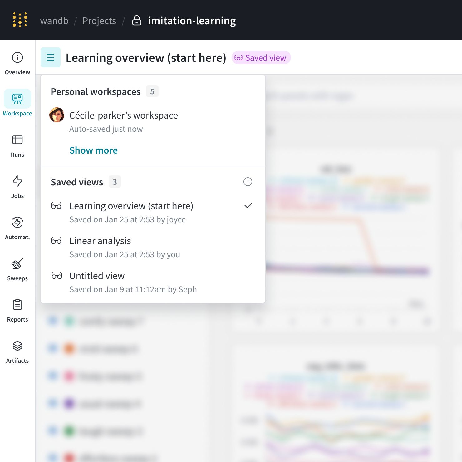 - 저장된 뷰: 저장된 뷰는 워크스페이스의 협업 스냅샷입니다. 팀의 모든 구성원이 저장된 워크스페이스 뷰를 보고, 편집하고, 변경 사항을 저장할 수 있습니다. 저장된 워크스페이스 뷰를 사용하여 Experiments, Runs 등을 검토하고 논의합니다.