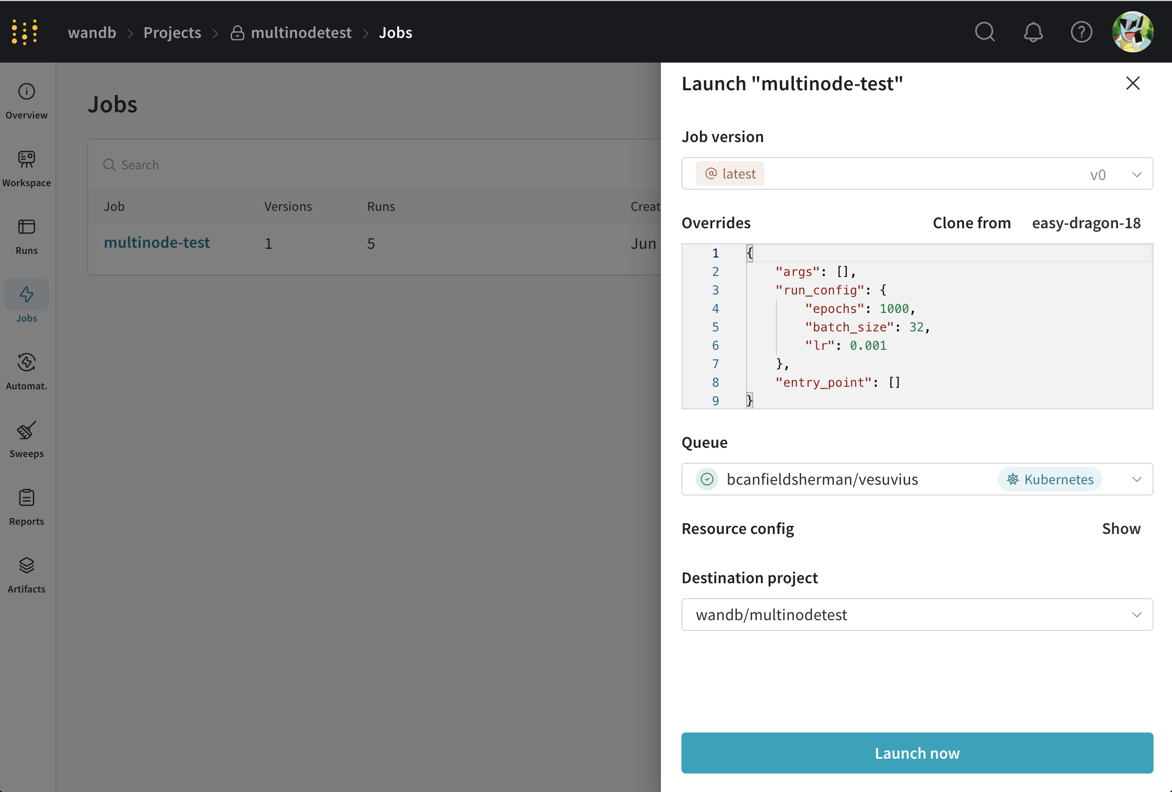 wandb.ai/launch (또는 wandb 서버의 사용자의 경우 <your-wandb-url>/launch)의 대기열 페이지에서 작업 상태를 확인할 수 있습니다.